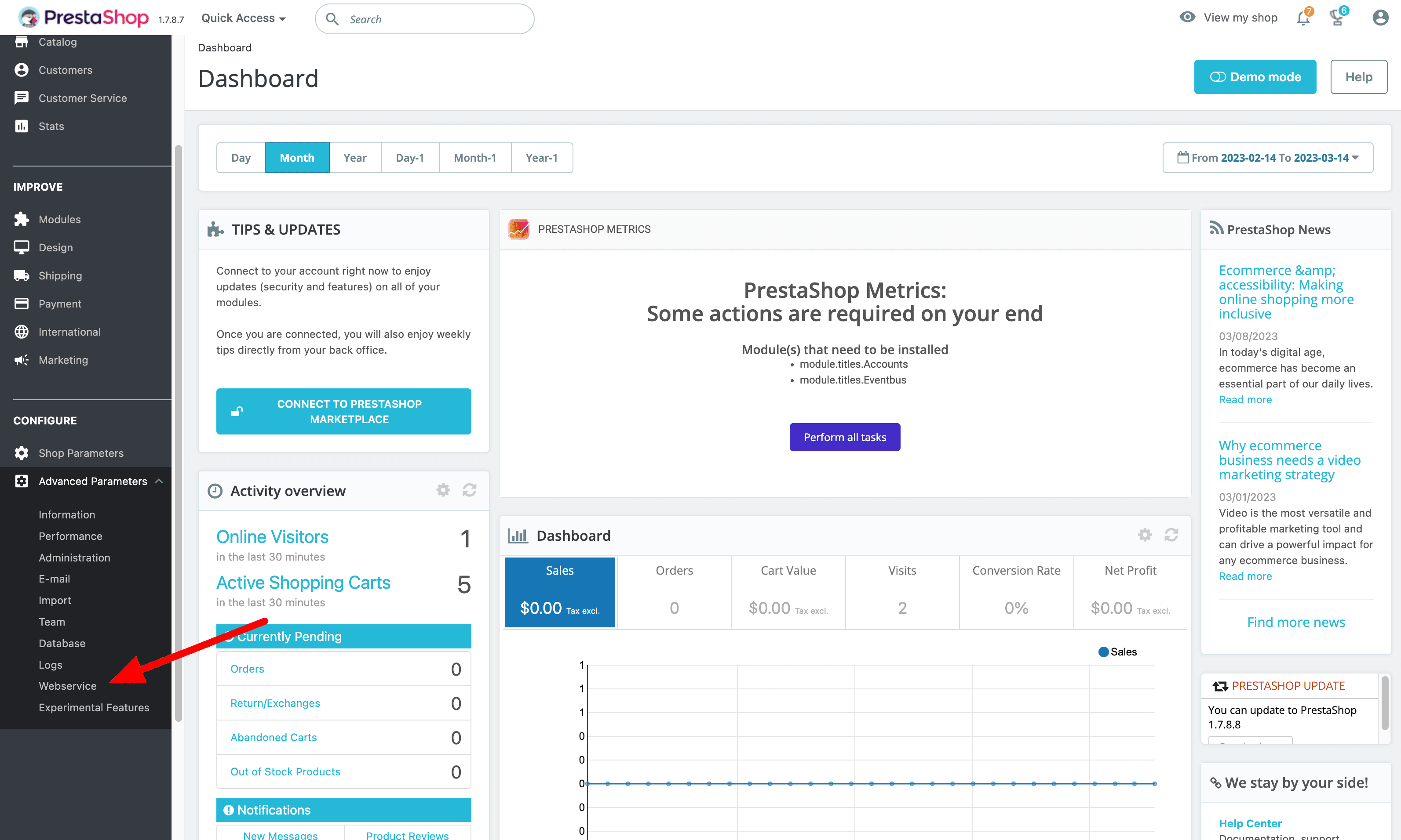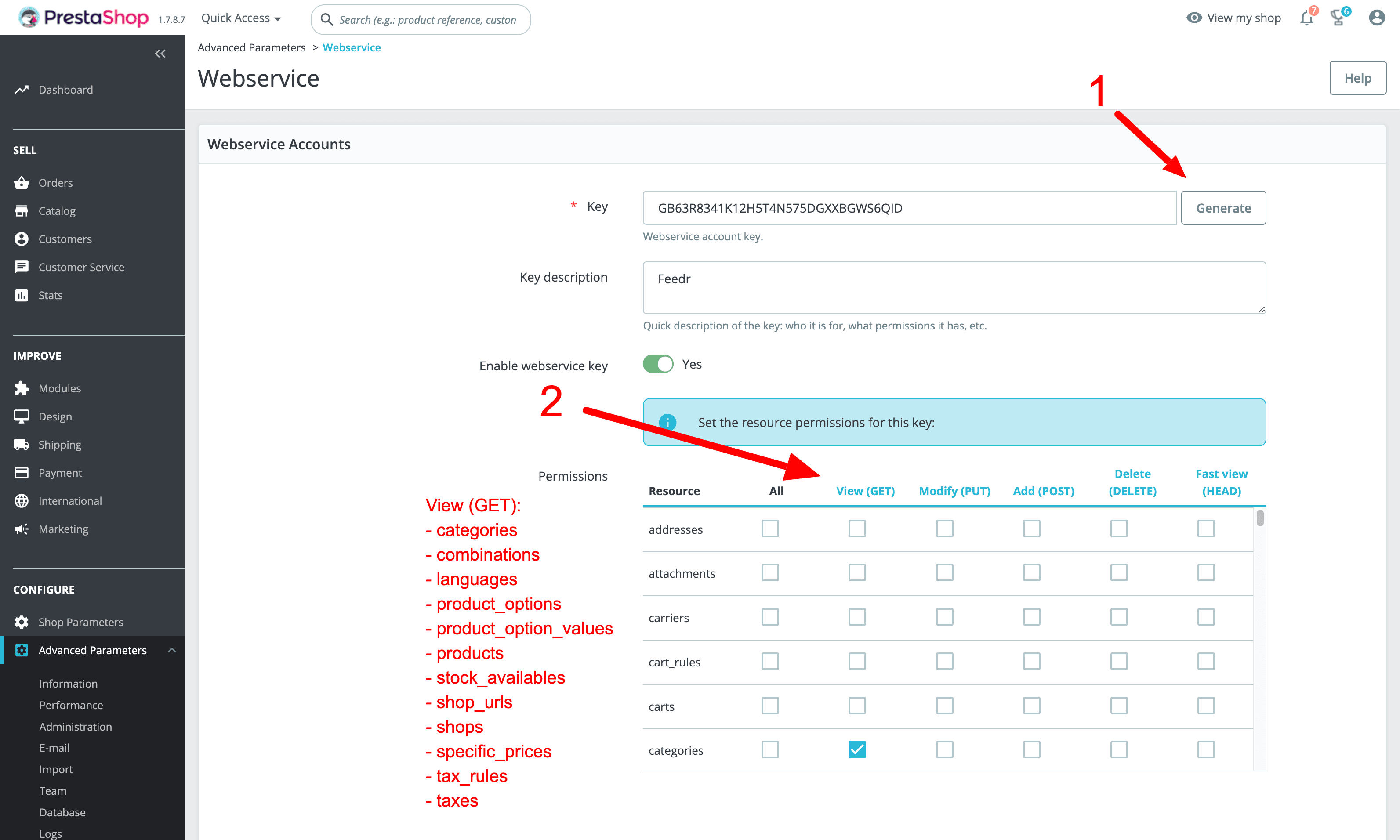The first step is to login to the backoffice of your PrestaShop website. Here you should go under Advanced Parameters and then click Webservice.