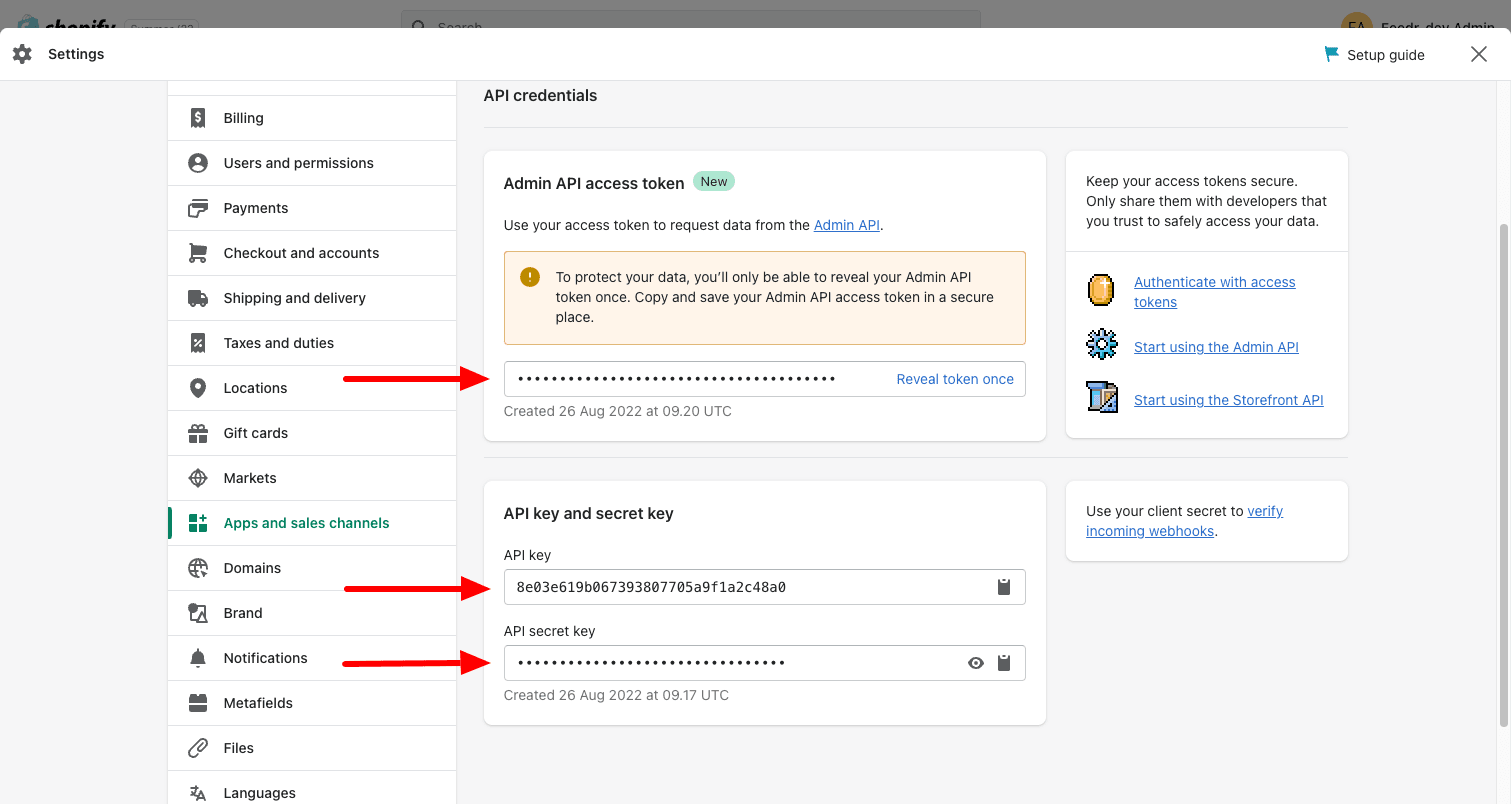 8. Now, Shopify will reveal three different keys, you'll need when creating your shop in Feed